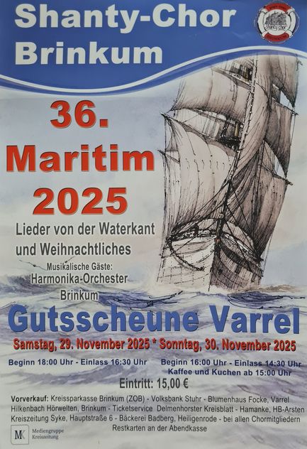 …wurde am 5. März 1985 gegründet. Unter seinem ehemaligen Chorleiter, Richard Hanning, wurde er weit über die Grenzen von Brinkum, einem Ortsteil der niedersächsischen Gemeinde Stuhr, am südlichen Stadtrand von Bremen gelegen, bekannt und beliebt. Seit seiner Gründung ist dieser reine Männer-Chor bei über 1300 unterschiedlichen Anlässen aufgetreten. Hierzu gehören Sendungen des Rundfunks und Fernsehens und die Teilnahme an traditionellen Feierlichkeiten und Festen der Hansestadt Bremen, sowie regionale Festlichkeiten, Schiffstaufen, Hafenfeste, Galas, Sportveranstaltungen, Benefiz-Konzerte, Gottesdienste und zahlreiche persönliche festliche Ereignisse.
